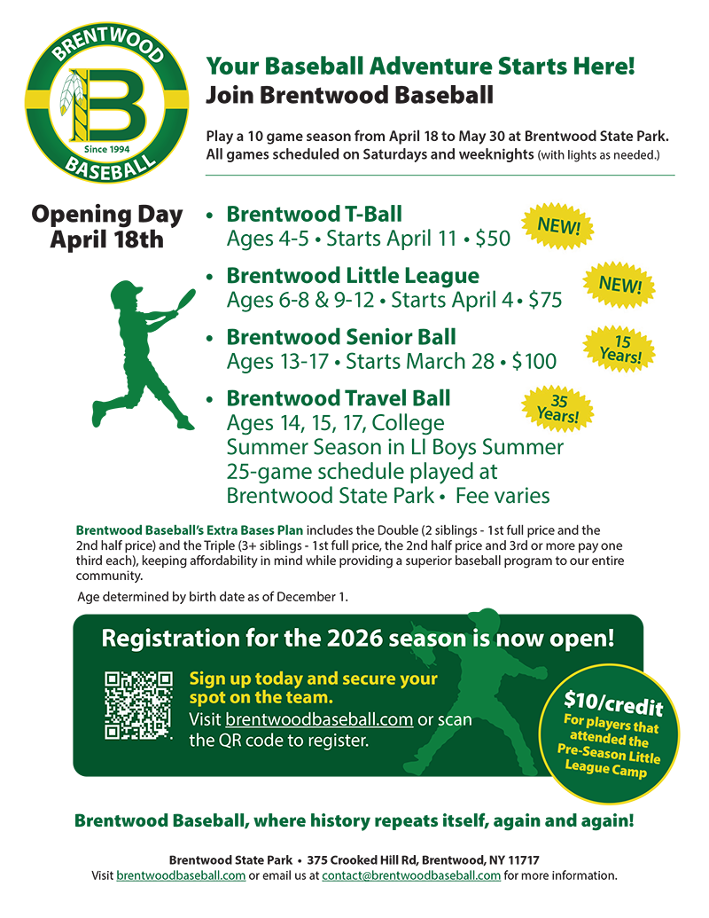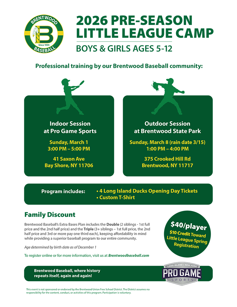 Brentwood Baseball Inc. strives to maintain a baseball program in the Suffolk County area; to promote, foster and advance in every manner, the common interests and goals engaged in the sport of baseball. To affiliate Brentwood Baseball with similarly constituted teams, leagues, associations and organizations; to foster and promote interest in baseball and other sports. To promote and provide social and athletic recreation to the youth of our community. To encourage and engage in organized play and competition with various teams, clubs, leagues, associations and organizations. To disseminate information to the general public concerning such events and activities. To develop those characteristics of honesty, good fellowship, self-discipline, team play, fairness and self-reliance amongst baseball players. To promote foster and encourage interest in athletics and physical exercise and generally endeavor to improve the health and welfare of the community at large.